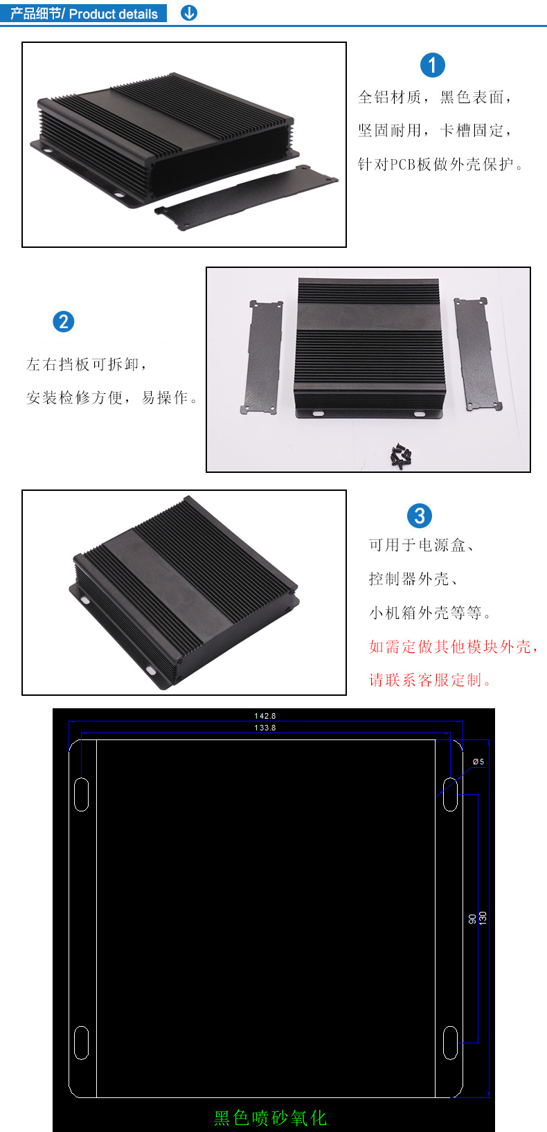 特點(diǎn):1.全鋁材質(zhì),黑色表面,堅(jiān)固耐用,卡槽固定,針對PCB板做外殼保護(hù)。
