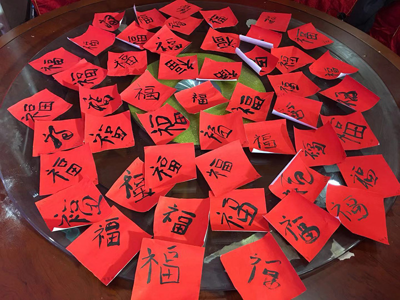 集福送祝福:每一位員工都將“福”字寫下,滿滿一桌子的祝福,送個自己,送個大家。